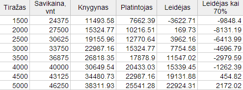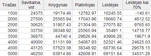 Padariau lentelę, kurioje aiškiai matosi kaip keičiasi leidyklos pajamos ir kaip leidybos rizika neveikia kitų dviejų proceso dalyvių. Iškart reiktų susitarti, kad tokios sąnaudos kaip darbuotojai, knygų dėliojimas, grąžinimas ir pan. yra visoms pusėms ir jas teisingai įvertinti čia nelabai įmanoma.